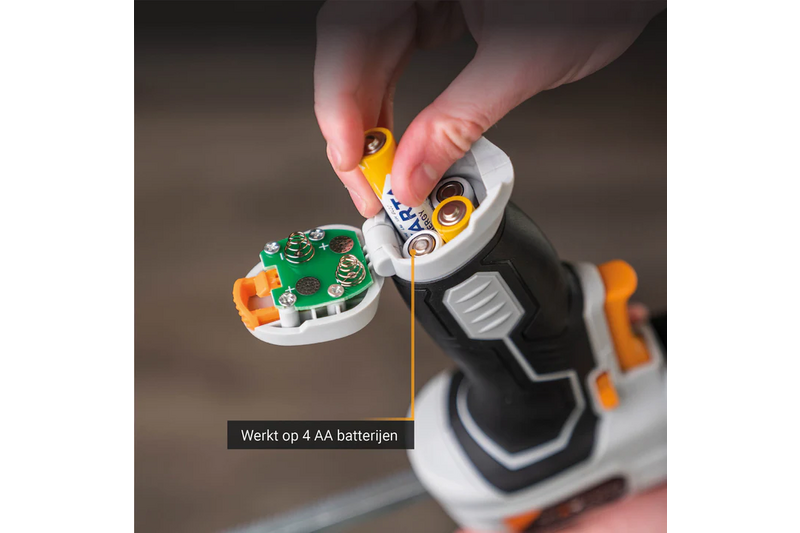 Dankzij de 4 AA-batterijen levert het 6V Kitpistool genoeg vermogen voor een betrouwbare, gelijkmatige toepassing, zonder extra gewicht. Het is het perfecte gereedschap voor kleine projecten, thuisreparaties of precisieklusjes, waar mobiliteit en gebruiksgemak het belangrijkst zijn. Of je nu in krappe hoekjes werkt of kit aanbrengt langs rechte randen, dit compacte kitpistool geeft je totale controle met minimale inspanning.