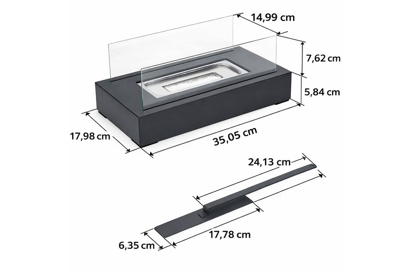 moderne rechthoekige bio-ethanol sfeerhaard in zwarte uitvoering. Het minimalistische design met strakke lijnen en transparante glazen windschermen maakt deze haard een elegante eyecatcher op tafel, dressoir of salontafel.